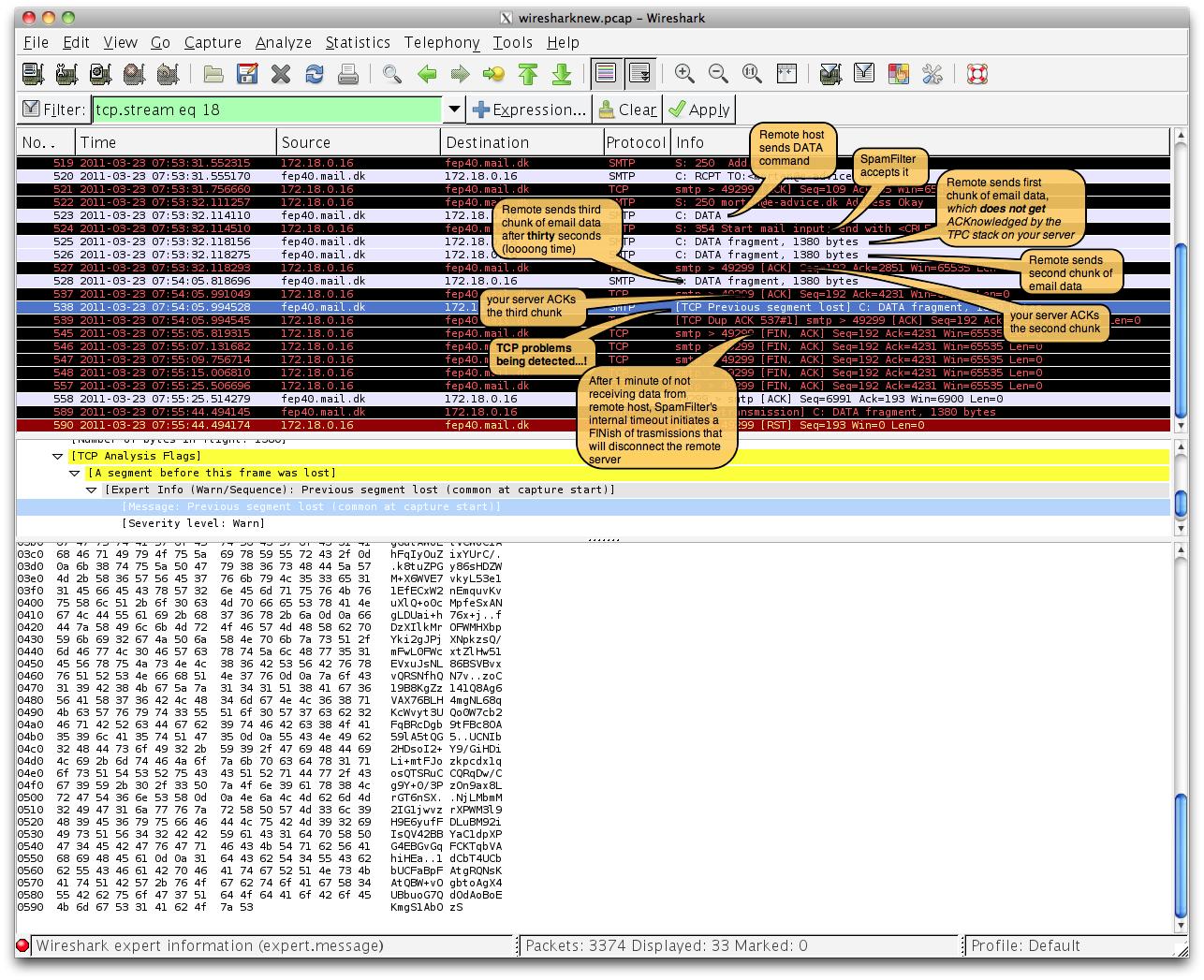 Hi Morten, The entries in the logfile for the email you did not receive were actually those for thread ID 7888 as follows: 03-23-11 12:53:21:359 -- (7888) Detected TCP Connection: 195.41.46.140 03-23-11 12:53:21:359 -- (7888) Connection from: 195.41.46.140 - Originating country : Denmark 03-23-11 12:53:31:515 -- (7888) Received MAIL FROM: <grafitek@tdcspace.dk> 03-23-11 12:53:31:531 -- (7888) Received RCPT TO: morten@e-advice.dk 03-23-11 12:53:32:078 -- (7888) RCPT TO: morten@e-advice.dk accepted 03-23-11 12:55:05:781 -- (7888) Disconnect I'll try to explain what happened with this screenshot. There was a "hiccup" with the TCP connection, but I can't be certain if it was on your side or with the remote side. Whatever the cause, because of it there was an interruption of the TCP flow between your server and the remote server. SpamFilter has a built-in timeout of 1 minute after which, if there is no data being exchanged, SpamFilter will terminate the connection, which is what happened here. You may try to increase this timeout to something in the order of 3-5 minutes (the parameter is the "ReadTimeout=60" in the SpamFilter.ini file, but I am not sure this would have helped in this case, as I can't tell if eventually the TCP session would have self-healed or not. Please note that SpamFilter simply disconnected the connection, it did not "reject" the email. This should have caused the remote SMTP server to retry sending the email after a brief interval, and not to report a non-deliverable notice back to the sender, as this simply simulates the network connection being dropped during the transmission (which should never generate a non-deliverable error if it's temporary). ![]() Edited by LogSat - 27 March 2011 at 11:45am |